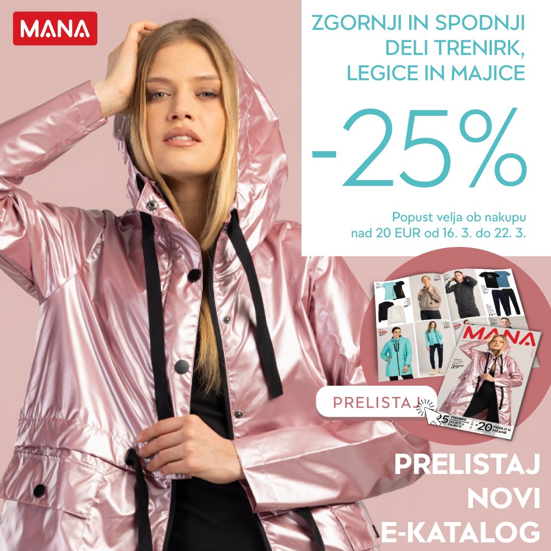 Prelistaj nov MANA e-katalog s TOP pomladno kolekcijo! Prešite jakne in brezrokavniki za odrasle že od 29, 99 eur. Izkoristi tudi 25 % popust na…