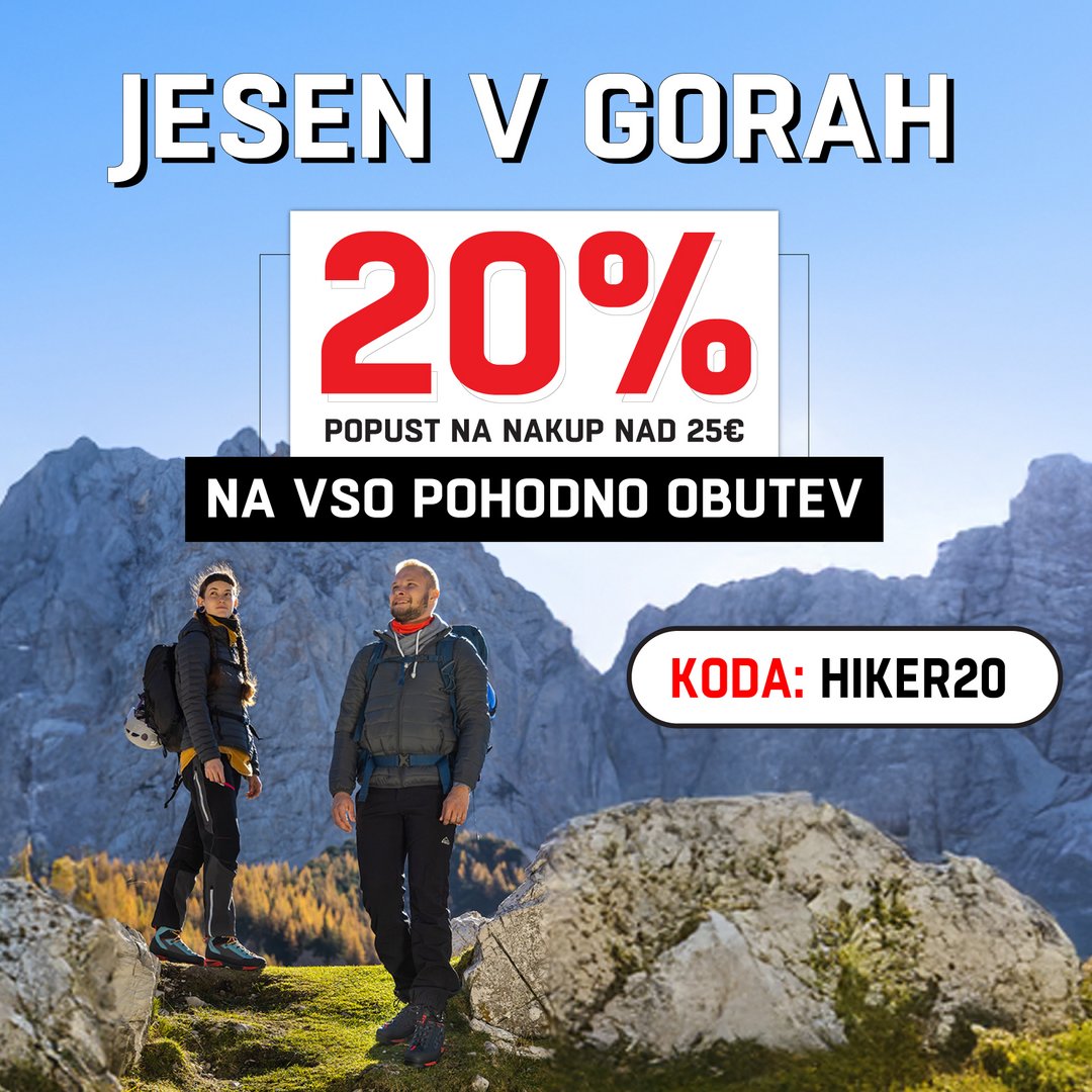 Če planiraš nove poti, nove izzive ali jesenski pobeg v naravo — zdaj je pravi trenutek. Z uporabo kode HIKER20 prejmeš dodatni 20 % popust na vso pohodno obutev, ki ti nudi: